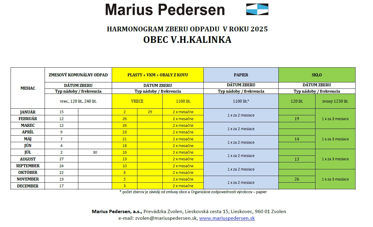 Harmonogram zberu odpadov V.H,Kalinka 2025